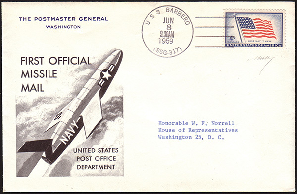[STATI UNITI] 1959 (8 giu.) Posta Razzo, razzogramma lanciato dal sommergibile "U.S.S. Barbero" con il missile "Regulus I", verso la stazione navale ausiliaria di Mayport, FL. Annullata in arrivo a Jacksonville. Allegata lettera autografa in originale firmata dal Postmaster General. Cert. Finanziario Bolaffi Cover