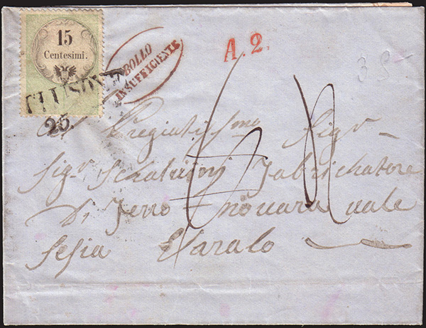 [LOMBARDO-VENETO] 1856 (25 nov.) Lettera affrancata con marca da bollo da 15c. con cifre e valore stampati in calcografia, per Varallo (Regno di Sardegna). Tiimbro in rosso "BOLLO INSUFFICIENTE" e tassata. Cover..........(Pt. 8 - Sass. 7)