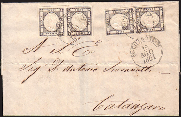 [PROVINCE NAPOLETANE] 1861 (18 ago.) Lettera da Cotrone a Catanzaro affrancata con 2 coppie, una verticale e una orizzontale dell' 1g. nero. Cover..........(Sass. 19)