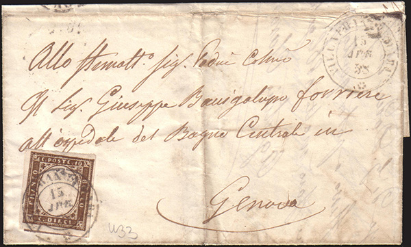 [SARDEGNA] 1858 (15 apr.) IV emissione, Contea di Nizza. Lettera non tassata, spedita da Villafranca Marittima per Genova, affrancata con 10c. terra d'ombra isolato. Cover..........(Pt. 10 - Sass. 14)