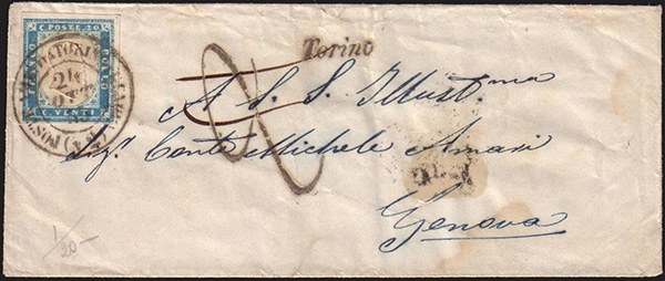 [SARDEGNA] 1855 (24 ott.) IV emissione. Busta da Torino a Genova affrancata con 20c. cobalto latteo chiaro, annullato "Poste amb.i tra Torino e Genova (N.2)", e "Torino" sulla soprascritta. Segni di tassazione corretti. Cover..........(Sass. 15c)