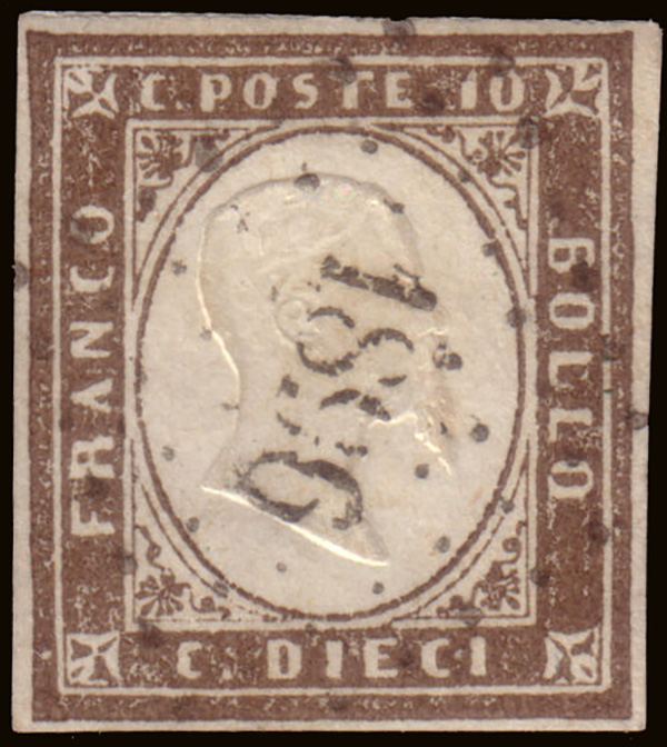 [SARDEGNA - NAVIGAZIONE] 1858 10c. terra d'ombra chiaro, annullato con il timbro numerale a piccoli punti con piccole cifre "1896" in dotazione a Marsiglia. Used..........(Pt. R1 - Sass. 14a)