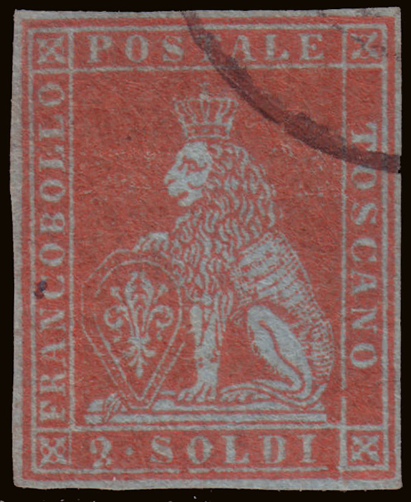 [TOSCANA] 1851 I emissione. 2s. scarlatto chiaro su azzurro. Firma Em. Diena, R. Mezzadri Used..........(Sass. 3)