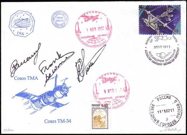 [RUSSIA] 2002 (30 ott.) Cosmogramma "Zaletin" con francobollo annullato dal timbro nero di Baykonur, timbro a doppio cerchio azzurro dell'epquipaggio del Soyuz TMA-1, timbro circolare rosso apposto sulla stazione quando la Soyuz TMA-1 si unì con l'ISS, timbro ottagonale della stazione ISS, timbro circolare rosso apposto sulla stazione quando il modulo Soyuz TM-34 si staccò per il ritorno a Terra, timbro posto all'arrivo alla Città delle Stelle - Mosca 11 novembre 2002. Il cosmogramma reca le firme autografe dei russi Zaletin e Lonchakov e del belga De Wine. Cover
