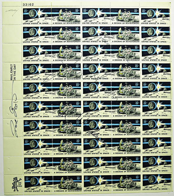 [STATI UNITI] 1971 Apollo 15, foglio completo del francobollo da 8+8c. "Moon Rover", firmato dai membri dell'equipaggio Scott, Worden e Irwin (primo "automobilista lunare"). Ex collezione "Icarus". Cert. Finanziario Bolaffi MNH