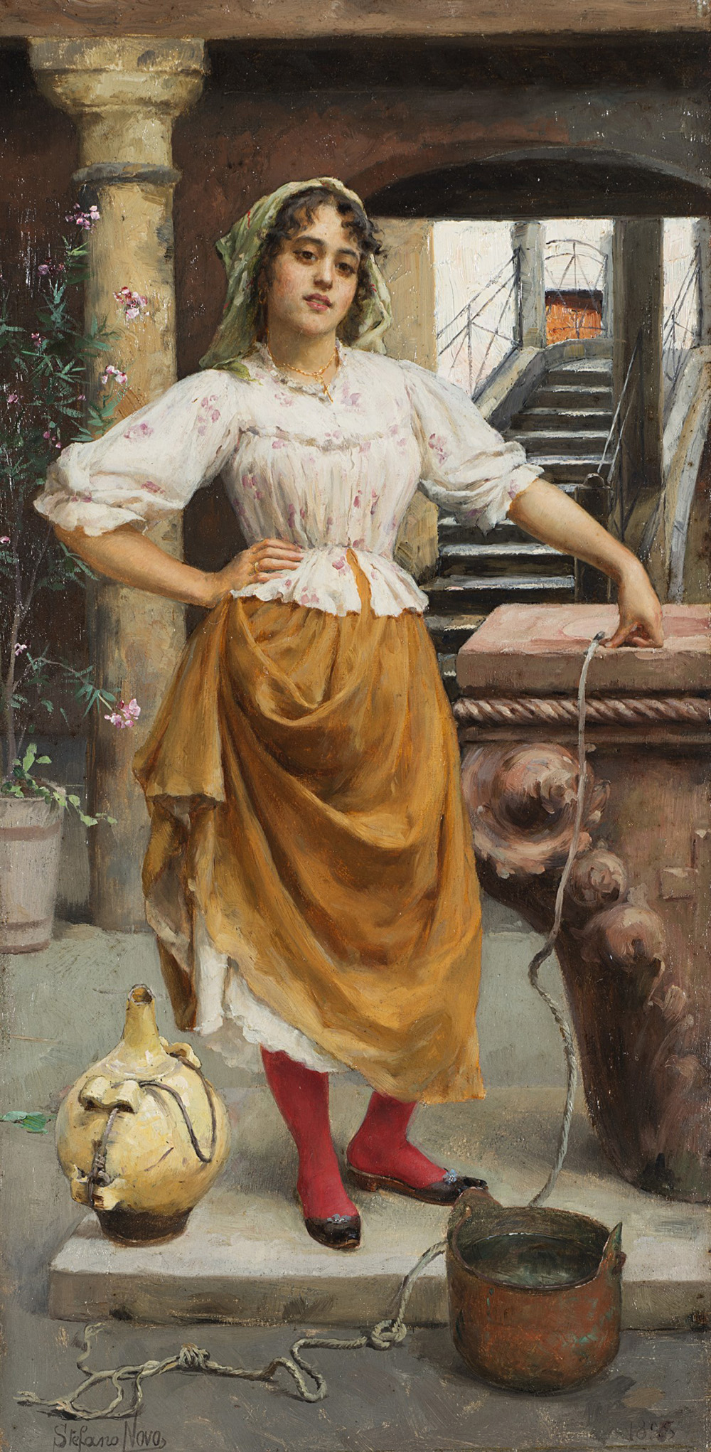 Stefano Novo (Cavarzere 1862 - 1927) "Ragazza al pozzo" olio su tavola (cm...