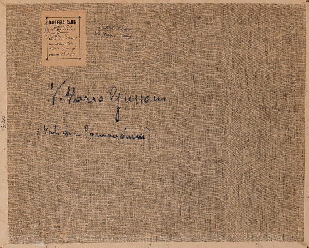 Vittorio Gussoni (Milano 1893 - Sanremo 1968) "Natura morta con funghi" olio su cartone telato (cm 40x49.5) Reca firma non coeva in basso a sinistra Al retro: cartiglio, timbri ed iscrizione Provenienza: Galleria Carini, Milano. Cartiglio al retro In cornice