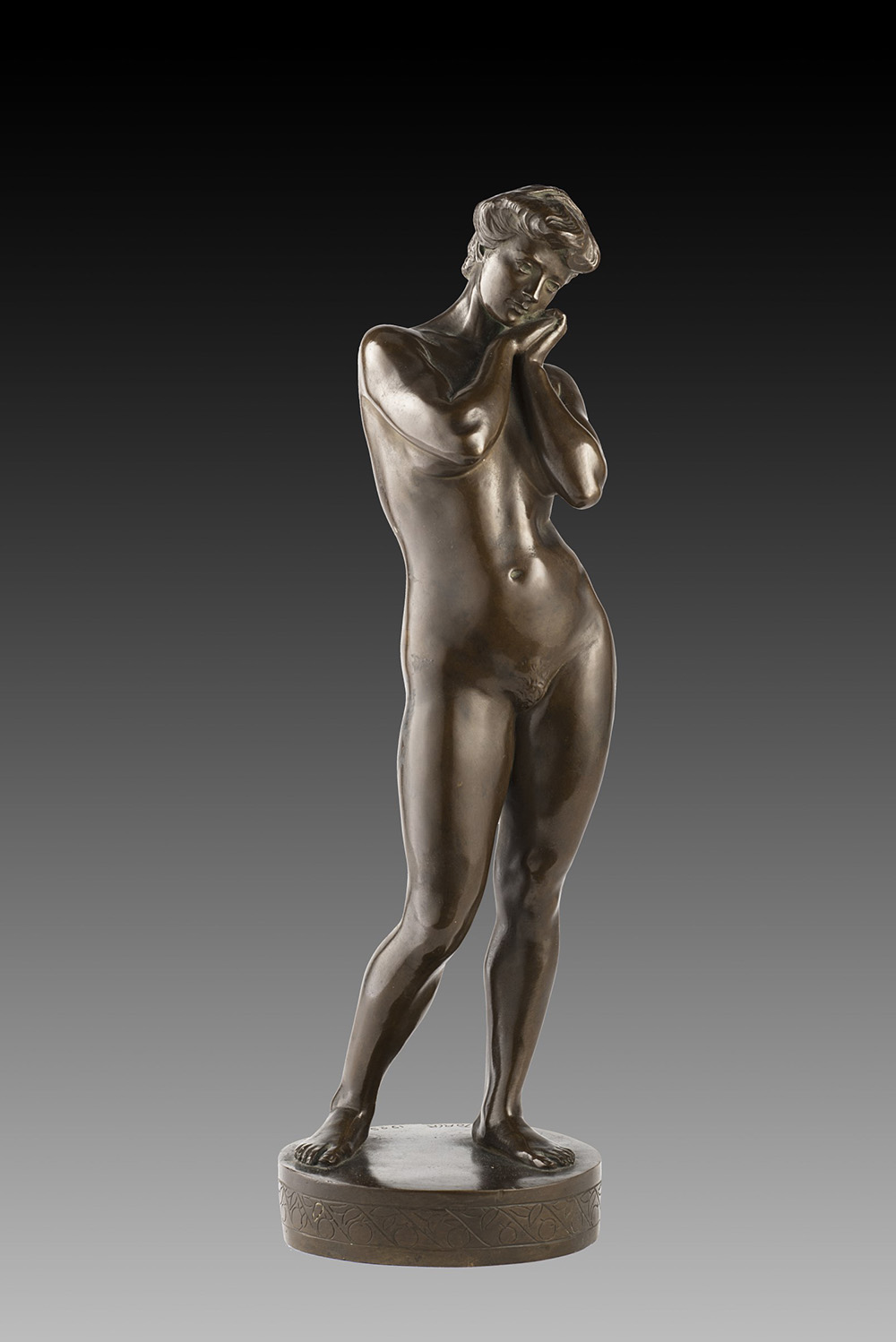 Frederic (Fritz) Storck (Bucarest 1872 - 1942) "Riflessioni" 1905 scultura in bronzo (h cm 34.5) Firmata e datata sulla base; inscritta al retro Sotto la base: cartiglio Esposizione: VII Esposizione Internazionale d'Arte della città di Venezia 1907. Cartiglio sotto la base Bibliografia: catalogo della VII Esposizione Internazionale d'Arte della città di Venezia 1907, opera citata a pag.74, n.43