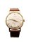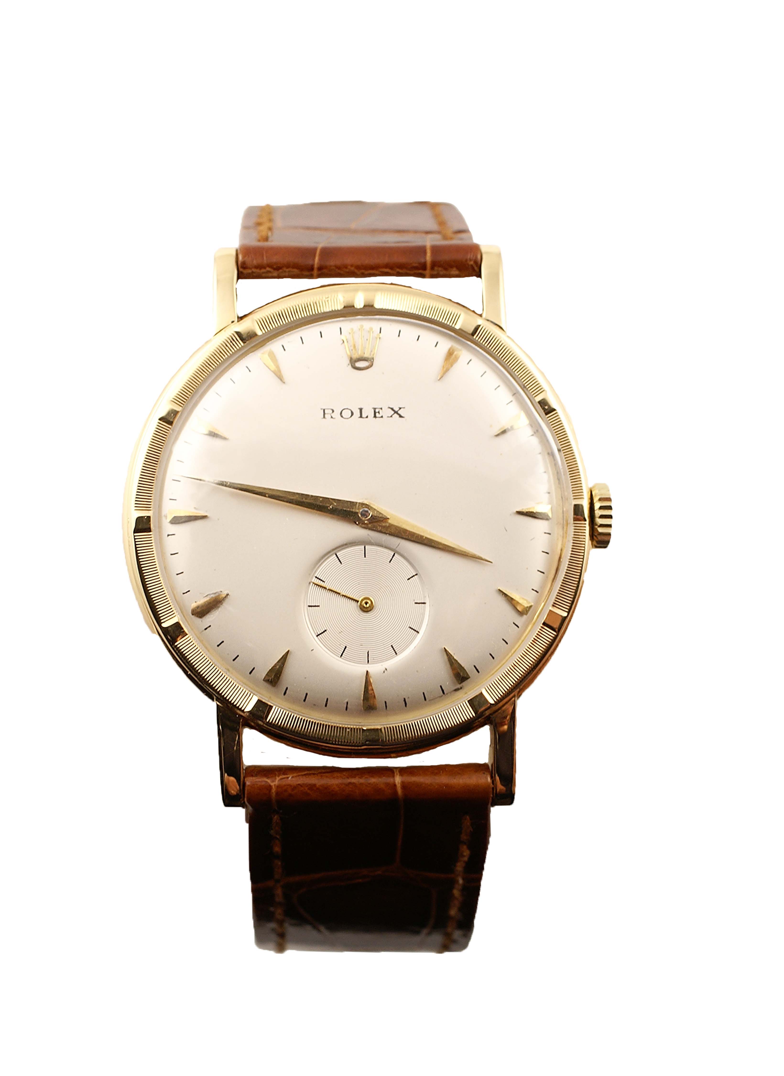 Orologio Rolex in oro giallo 18kt, cassa tonda, quadrante argentato con indici dorati, contasecondi ore 6, movimento meccanico a carica manuale, bracciale in pelle con fibbia originale placcata in oro, anni 50/60, ref. 9164/23331, con scatola .