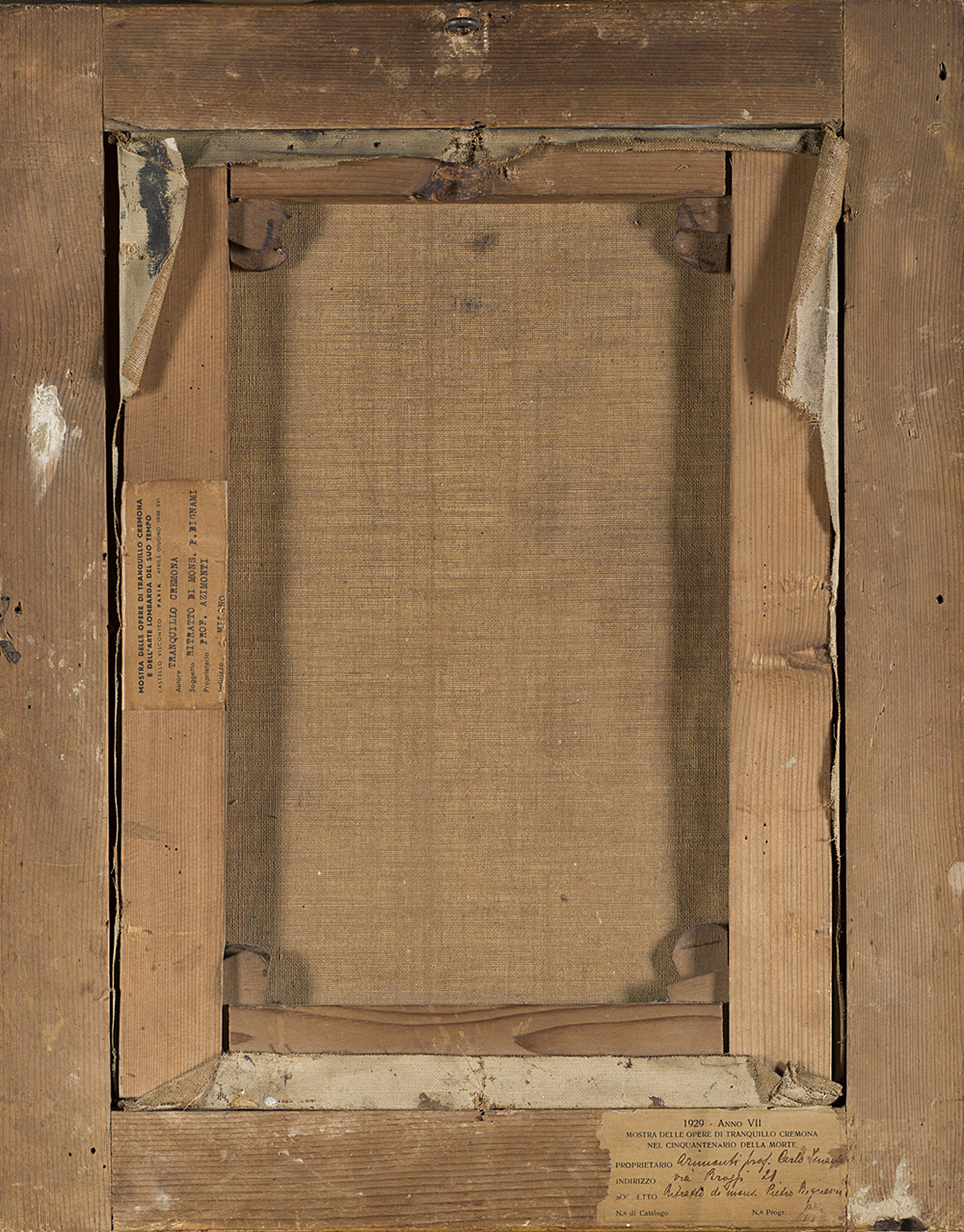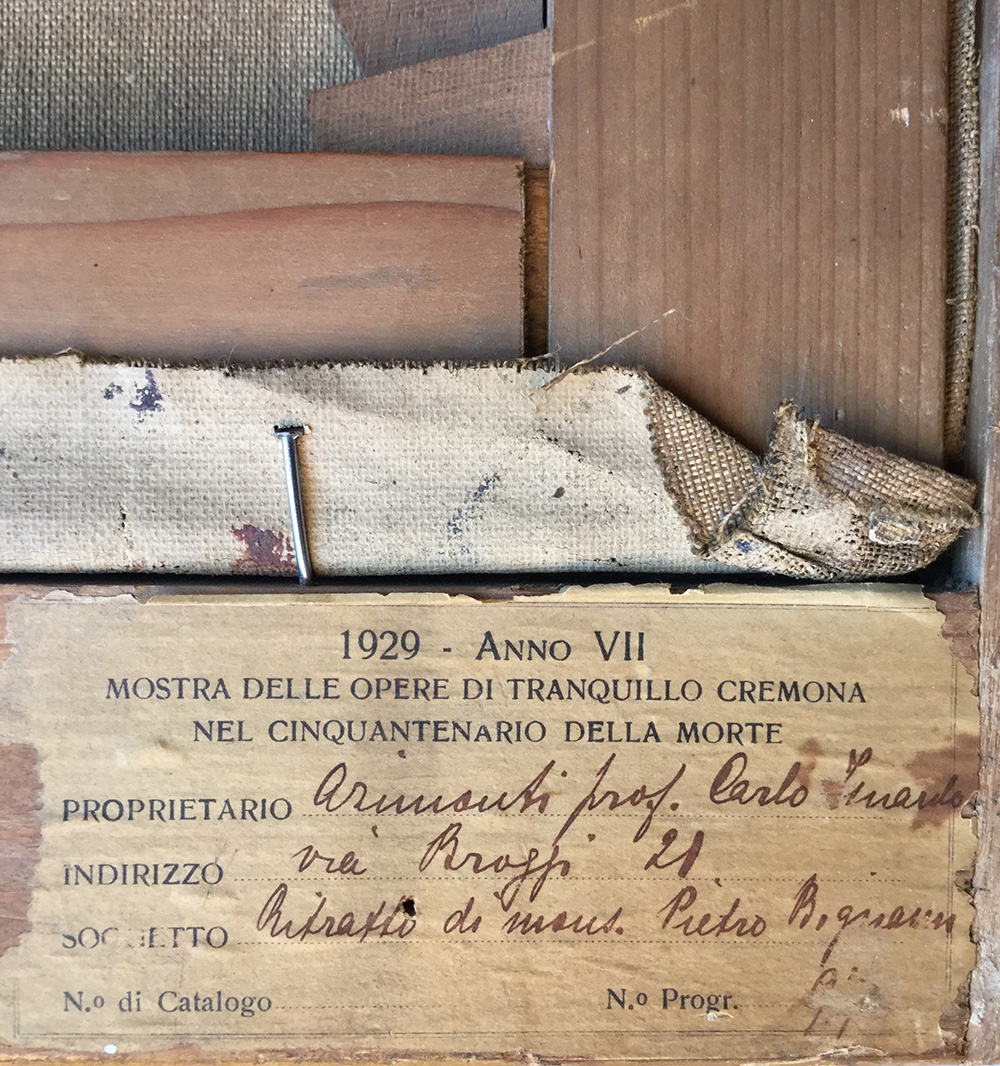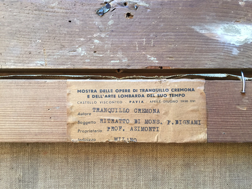 Tranquillo Cremona (Pavia 1837 - Milano 1878) "Ritratto di monsignor Pietro Bignami" olio su tela (cm 41x30) Siglato in basso a sinistra Al retro: cartigli Provenienza: Monza, Pietro Bignami; Milano, Carlo Azimonti dal 1929 al 1938 Esposizioni: 1929, Milano mosta delle opere di Tranquillo Cremona nel cinquantenario della morte. Cartiglio al retro; 1938 aprile/giugno Mostra delle opere di "Tranquillo Cremona e dell'arte lombarda del suo tempo" Pavia castello Visconteo, n. 117. Cartiglio al retro Bibliografia: Pisa, 1899 pag.68; Mostra commemorativa 1929, n.2; Nicodemi 1933 pag. 230; Catalogo 1938 mostra delle opere di "Tranquillo Cremona e dell'arte lombarda del suo tempo" opera citata a pag.31; R.Bossaglia "Tranquillo Cremona Catalogo Ragionato" 1994 Federico Motta Editore, opera citata e riprodotta in bianco e nero a pag.181 tav.201 In cornice