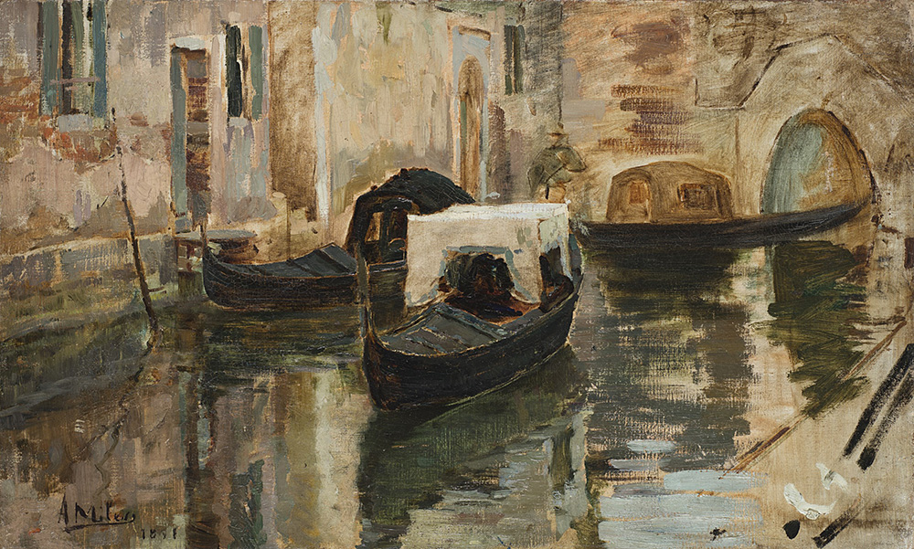 Alessandro Milesi (Venezia 1856 - 1945) "Gondole in riposo" 1881 olio su tela (cm 44x73) Firmato e datato in basso a sinistra Al retro: cartiglio con titolo In cornice