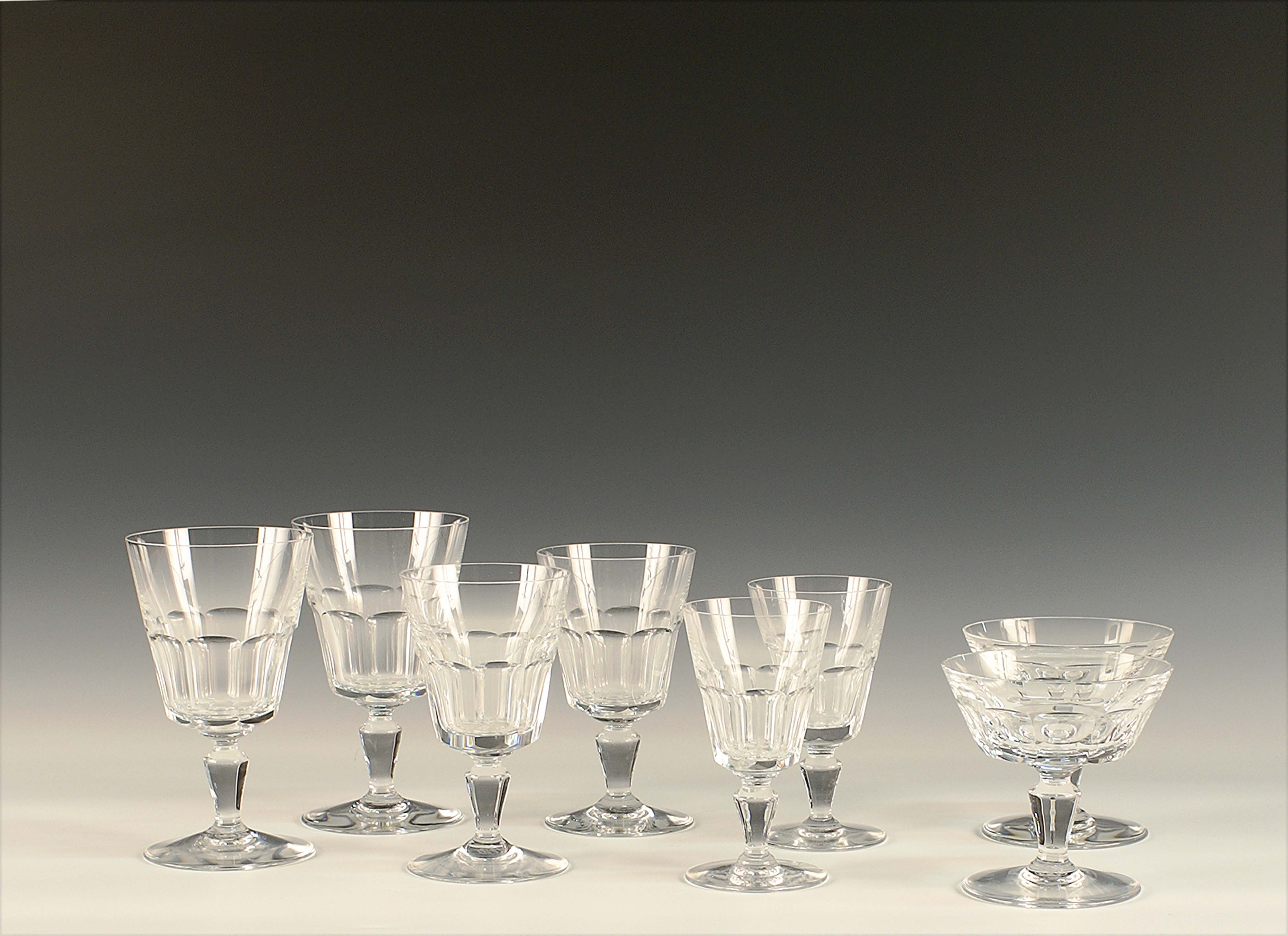 Servizio di bicchieri in cristallo Baccarat, composto da dodici bicchieri acqua, nove bicchieri vino rosso, dodici bicchieri vino bianco e dodici coppe champagne, firmati sotto la base.