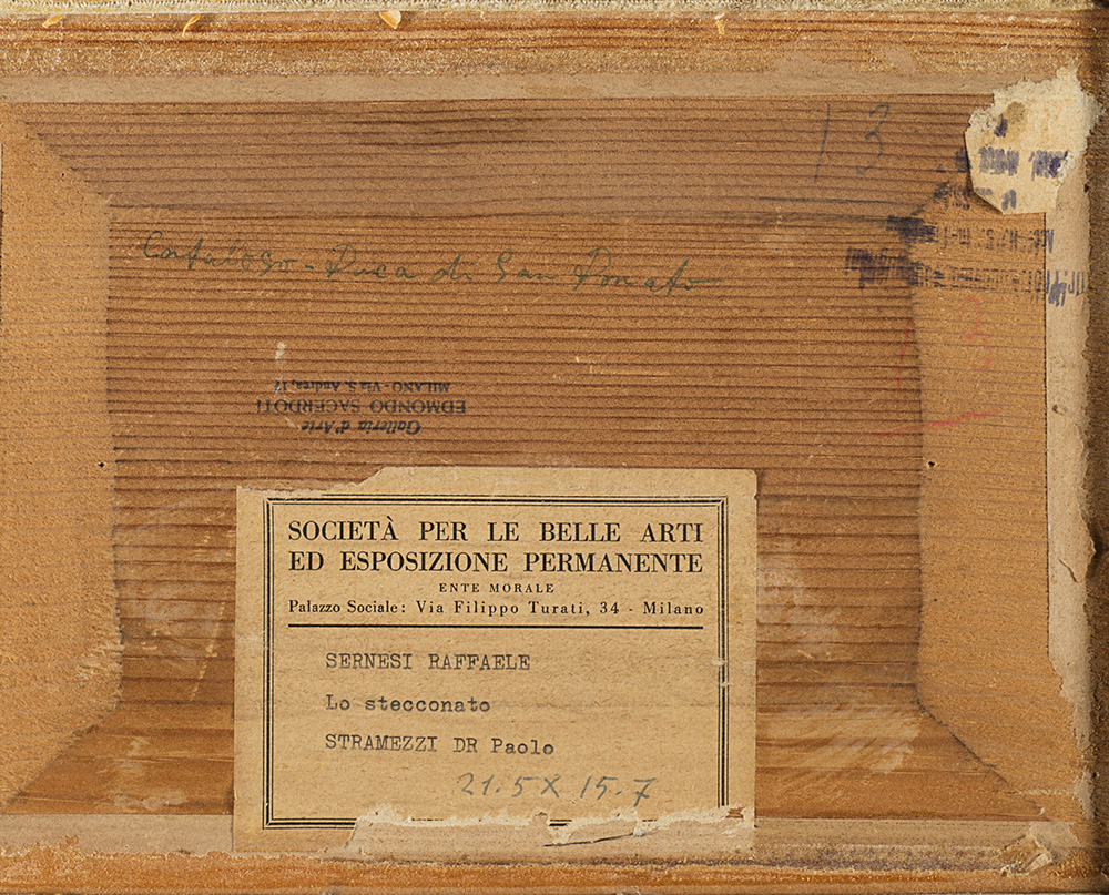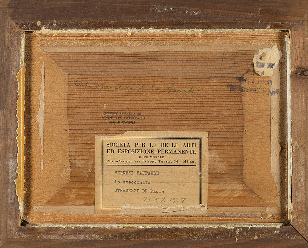 Raffaello Sernesi (Firenze 1838 - Bolzano 1866) "Lo Stecconato" olio su tavoletta (cm 16x21.5) Al retro: cartiglio, timbro ed iscrizione Provenienza: Raccolta dell'avv.Domenico Tempestini, Firenze; 1930 marzo, Galleria Pesaro Milano "La Raccolta del Duca di San Donato di Napoli"; Galleria d'Arte Edmondo Sacerdoti, Milano. Timbro al retro Esposizioni: Società per le Belle Arti ed Esposizione Permanente. Cartiglio al retro Bibliografia: Bestetti e Tuminelli 1930 "La Raccolta del Duca di San Donato di Napoli" opera citata e riprodotta alla tavola LXIX n.144 In cornice (difetti)