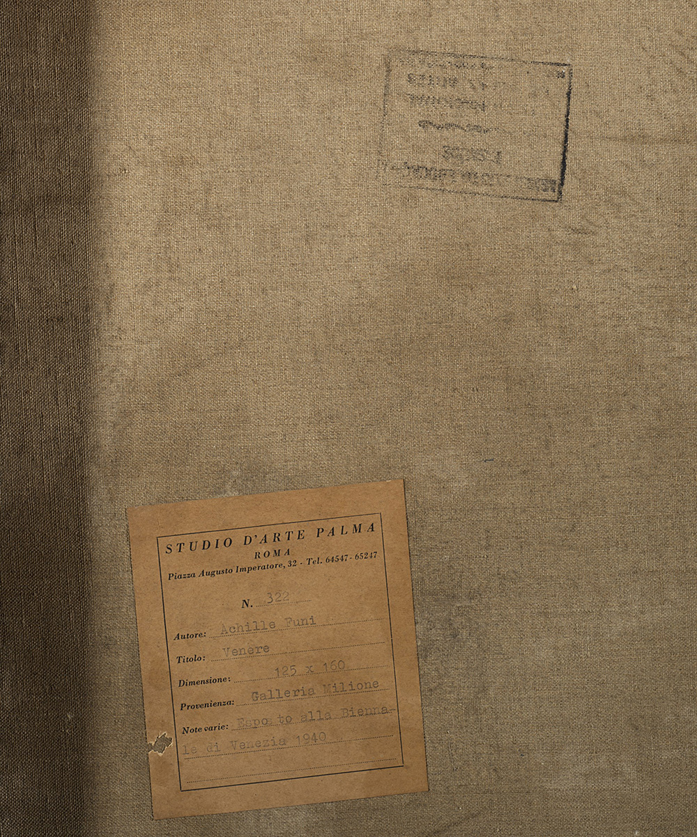 Achille Funi (Ferrara 1890 - Appiano Gentile 1972) "La Venere latina (Nudo/Il nudo e le sculture)" 1930 olio su tela (cm 160x125) Firmato e datato in basso a destra Al retro: cartigli e timbro Provenienza: Galleria Milione; Studio d'Arte Palma, Roma. N. 322. Cartiglio al retro Esposizioni: 1930, XVII Esposizione Internazionale d'Arte della Città di Venezia. Cartiglio al retro; 1931 luglio, Galleria Milano, Milano. Tracce di cartiglio al retro; 1932 febbraio, Galleria Milano, Milano. Cartiglio al retro; 1973 ottobre/dicembre, "Achille Funi" Palazzo della Permenente, Milano, Ripartizione cultura turismo spettacolo. Cartiglio al retro Bibliografia: Catalogo XVII Esposizione Internazionale d'Arte della città di Venezia 1930, opera citata a pag.78, n.13; E.Lavagnino "L'Arte Moderna dai Neoclassici ai Contemporanei" 1961 Unione Tipografico - Editrice Torinese, V Volume, Tomo secondo dalla Storia dell'Arte Classica e Italiana. Opera citata e riprodotta alla fig.1104; Catalogo mostra "Achille Funi" 1973, opera citata a pag.28 n.44 e riprodotta a pag.100;