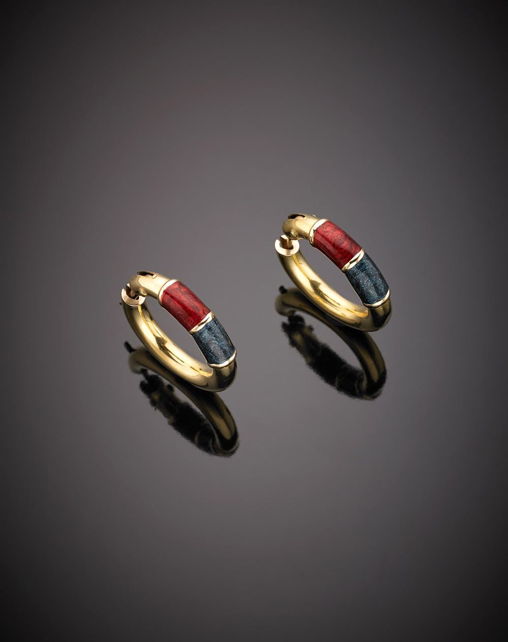 Orecchini ad anella in oro giallo e smalti rosso e blu, g.4,80 Yellow gold and enamel earrings, g.4,80