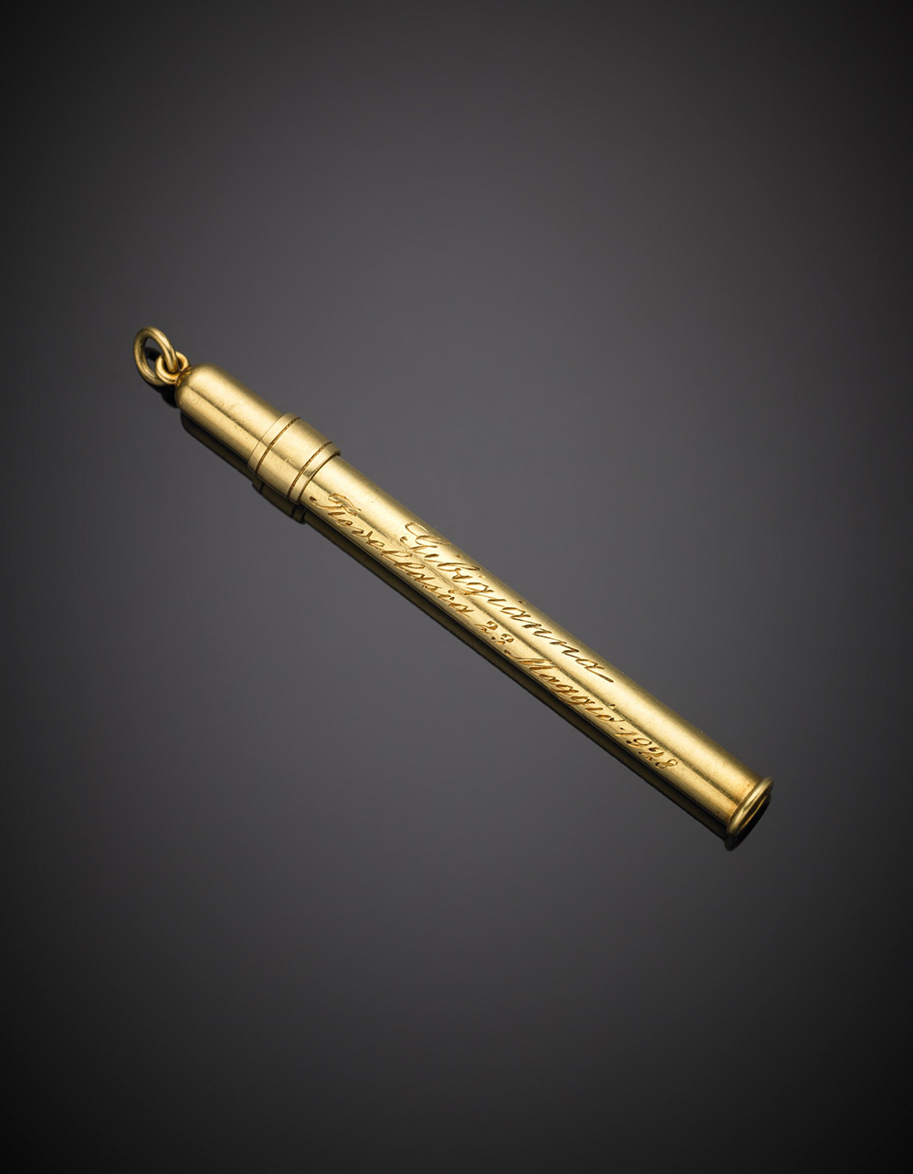 Portamatita in oro con dedica, netti g.7,40 lungh. cm 7,7 Yellow gold pencil holder, net g.7,40 length cm 7,7