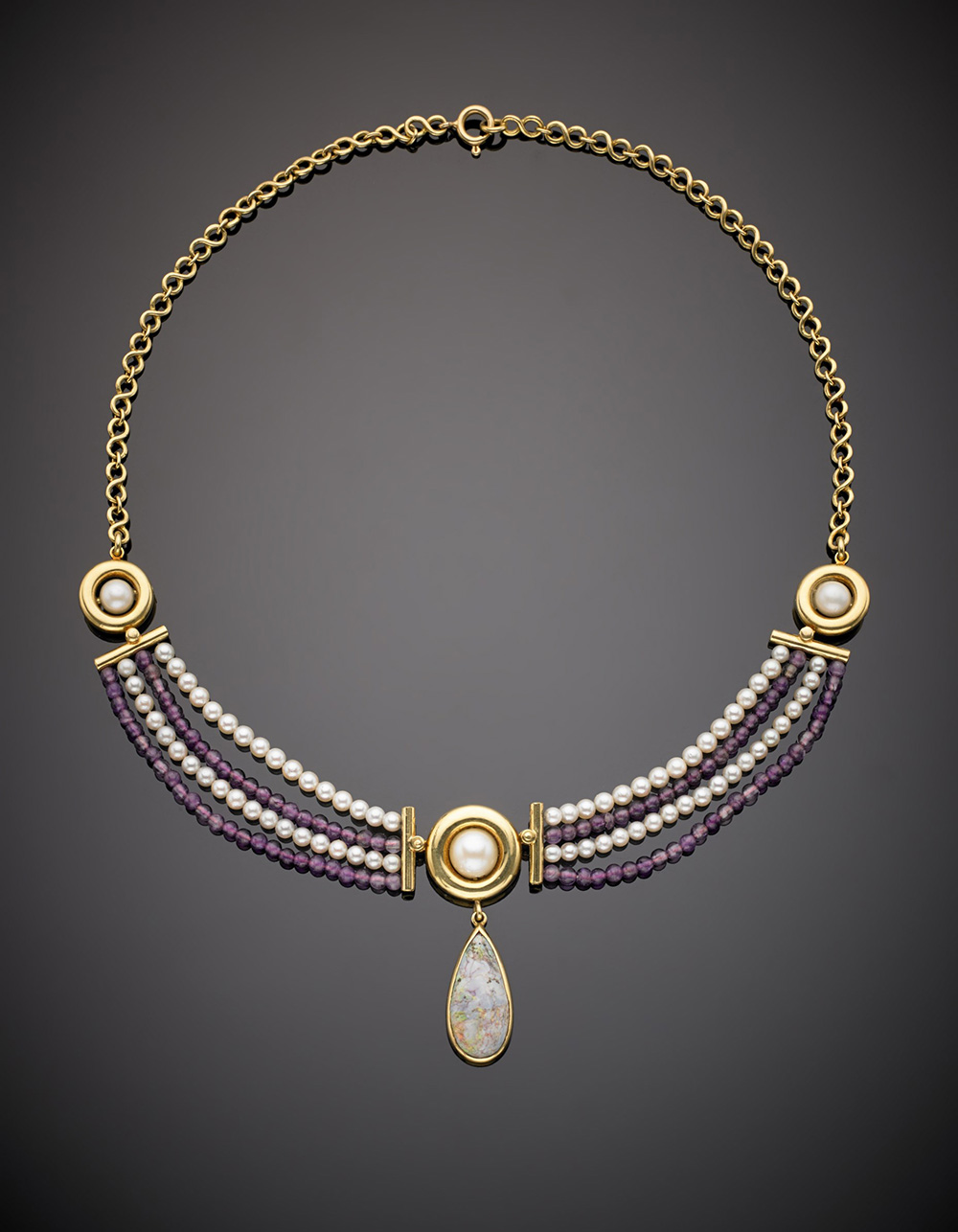 Lot 1014 | Collier in oro giallo, perle bianche, ametiste e opale a goccia cabochon, g....