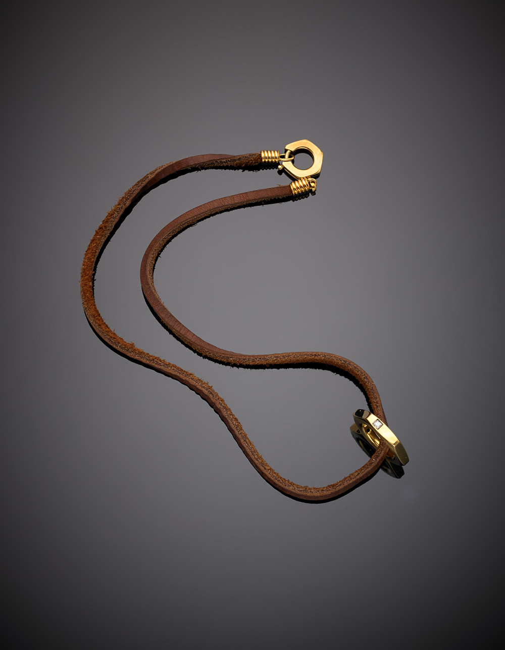 PRINCESS Cordone con chiusura e ciondolo in oro e diamanti, g.14,50 lordi lungh. cm 45 circa PRINCESS Leather string with yellow gold and diamond clasp and pendant, g.14,50 gross length cm 45 circa