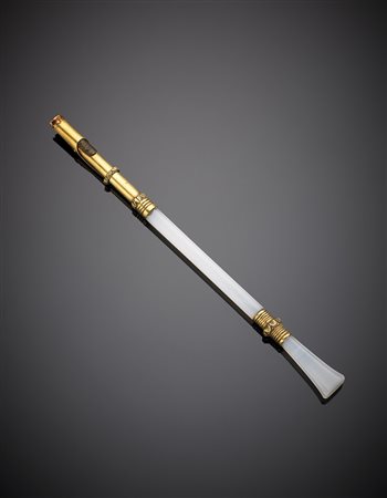 Elemento decorativo in oro 333/1000 e metallo, rifinito con quarzo microcristallino opalescente, g. 14,40, lungh. cm 14,50 9K gold and micro-crystal quartz fountain pen g. 14,40 length cm 14,50