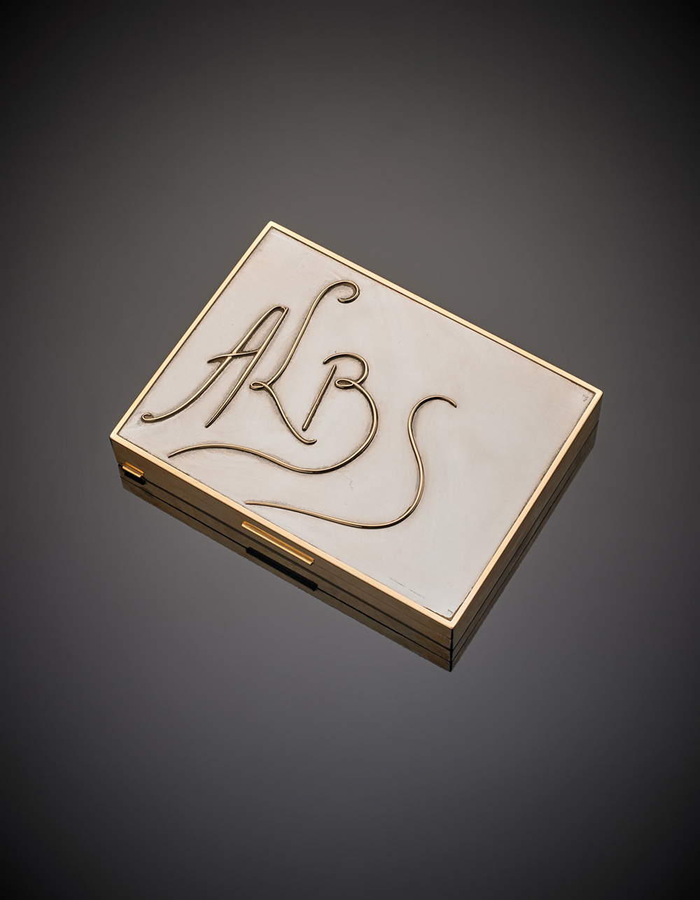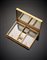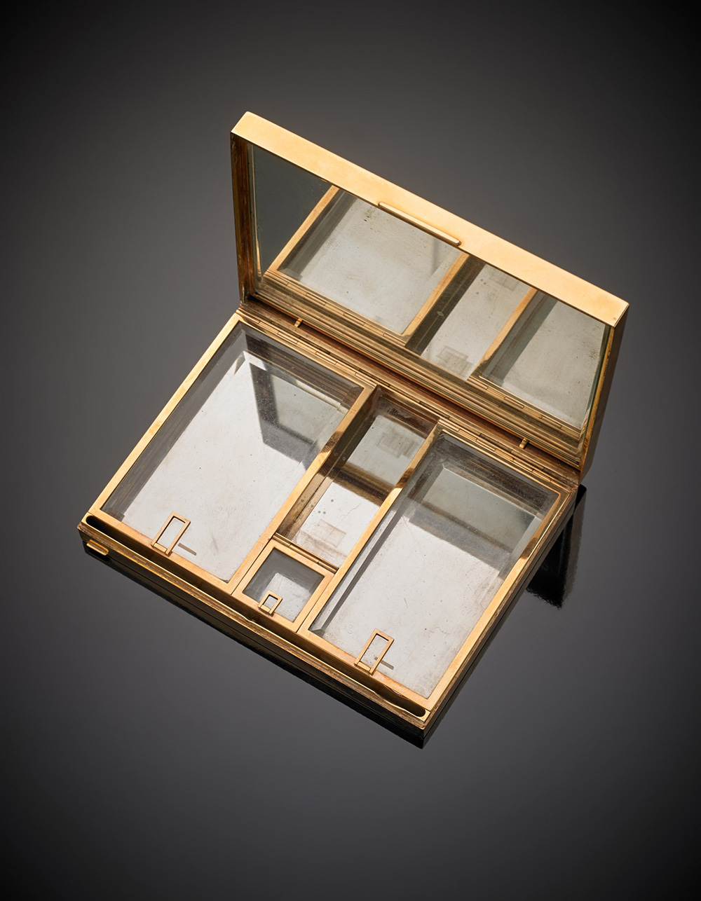 Beautycase in oro giallo/rossatro con rifiniture in metallo satinato, vetro e specchio, in rilievo le lettere "ALBS" marchio dell'oro 750 e del Fascio, g. 364,70, misure cm 12x9x1,7 circa Yellow gold beautycase with glazed metal, glass and mirror finishings, letters "ALBS" in relief, marked 750 and fascist stamp, g.364,70 measurement cm 12x9x1,7 c.