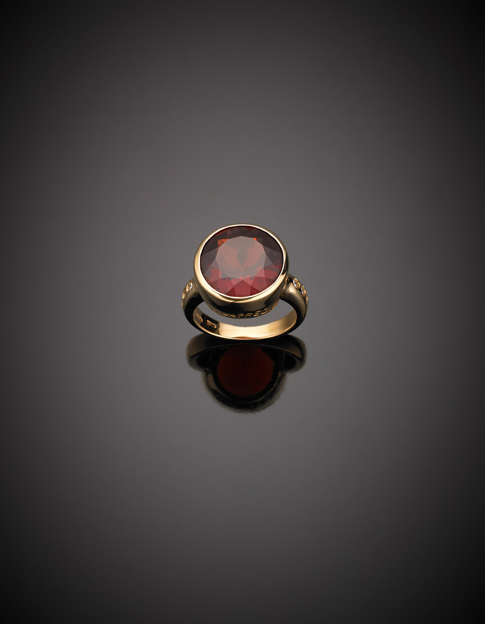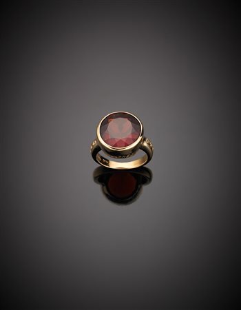 MANFREDI Anello in oro giallo con diamanti sul gambo ed al centro un granato piropo rotondo di ct.8,03, g. 11,80, misura 13/53 MANFREDI Yellow gold, ct.8,03 round pyrope garnet ring and diamond surround, g. 11,80, size 13/53