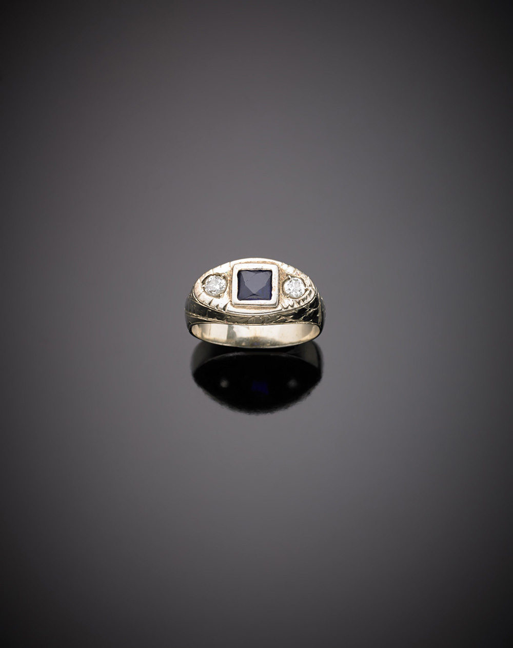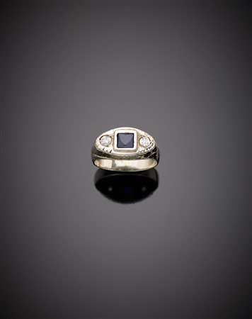 Anello in oro bianco con diamanti rotondi e zaffiro quadrato, g.4,40 misura 14/54 White gold diamond and carré sapphire ring, g.4,40 size 14/54