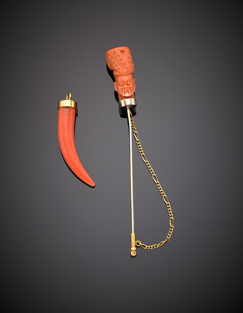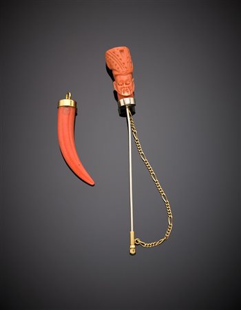Lotto composto da spillone e pendente in oro e corallo arancio, g.11,30, lungh. spillone cm 9,5, lungh. pendente cm 4,4 circa Lot composed of yellow gold orange coral tie pin and pendant, g.11,30, tie pin cm 9,5 pendant cm 4,4 circa