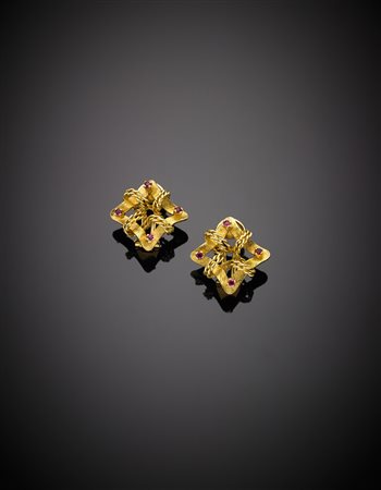 Orecchini quadrati in oro giallo, con intreccio di funi e otto rubini, g.8,80...