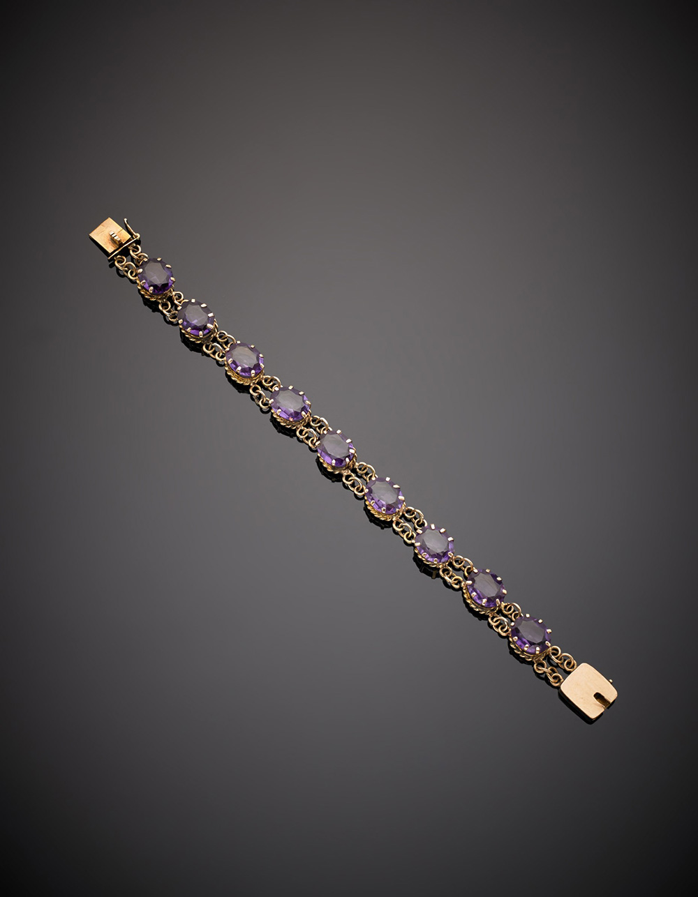 Bracciale in oro rosso con corindoni sintetici ovali ad imitare l'alessandrite, g. 15,70 lungh. cm 17 circa Red gold synthetic colour change sapphire bracelet, g.15,70 length cm 17 circa