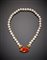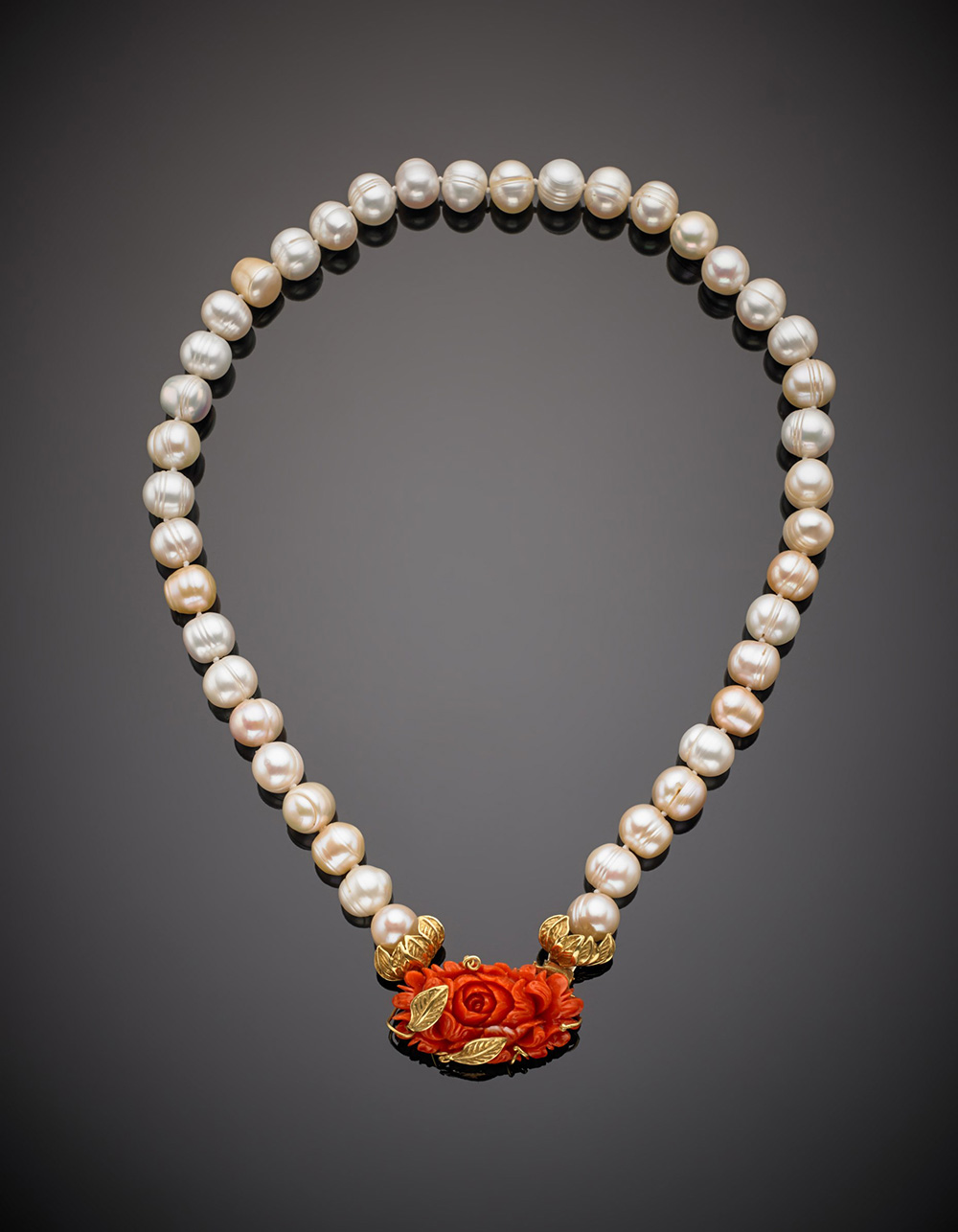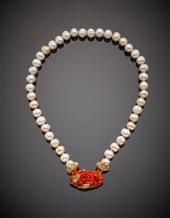 Collana di perle irregolari d'acqua dolce bianche di varie sfumature di mm 10/11 circa, con al centro chiusura in oro giallo e corallo arancione scolpito con disegno floreale, g. 87,60, lungh. cm 48,5 circa Freshwater irregular, variably hued pearl necklace with a yellow gold carved orange coral floral clasp, pearl diam. mm 10/11 circa, g.87,60 length cm 48,5 circa