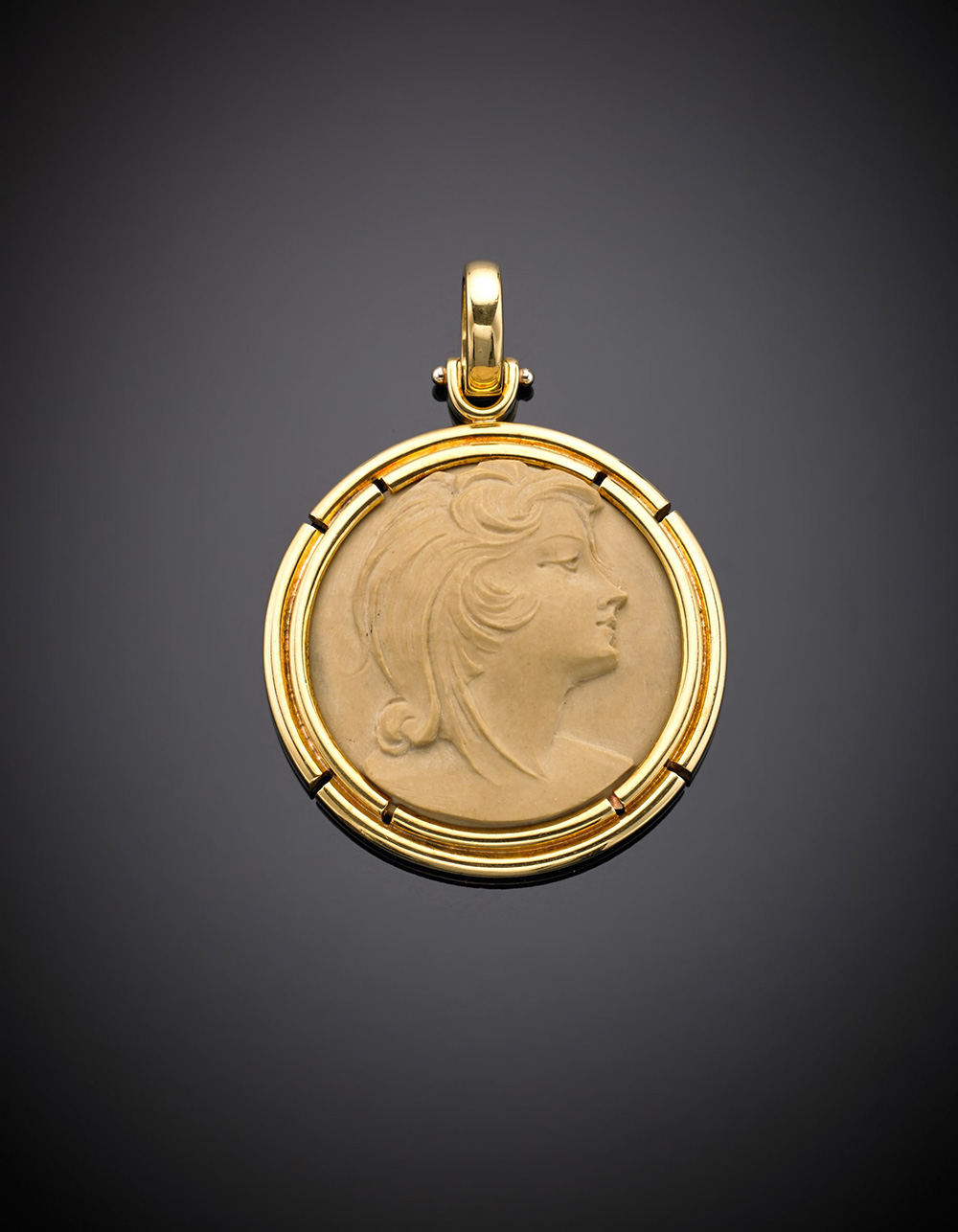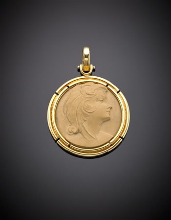 Pendente rotondo in oro giallo a tenere un cammeo di pietra lavica color nocciola g.22,50, diam. cm 3,5 circa Yellow gold and hazel lava stone cameo pendant g.22,50 diam. cm 3,5 circa
