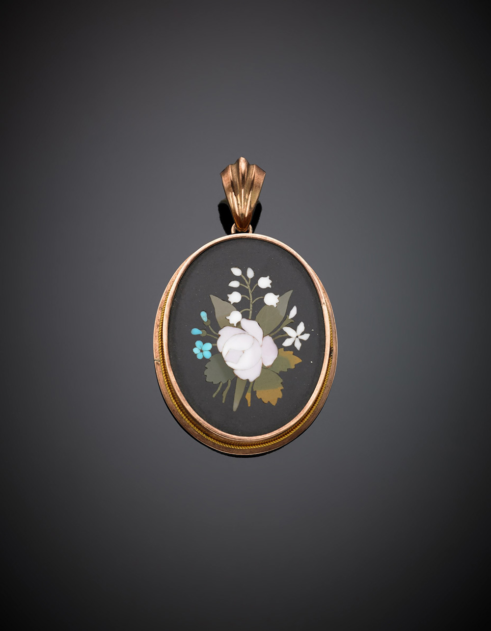 Pendente in oro rosso 333/1000 con mosaico di fiori in pietre dure su onice,...