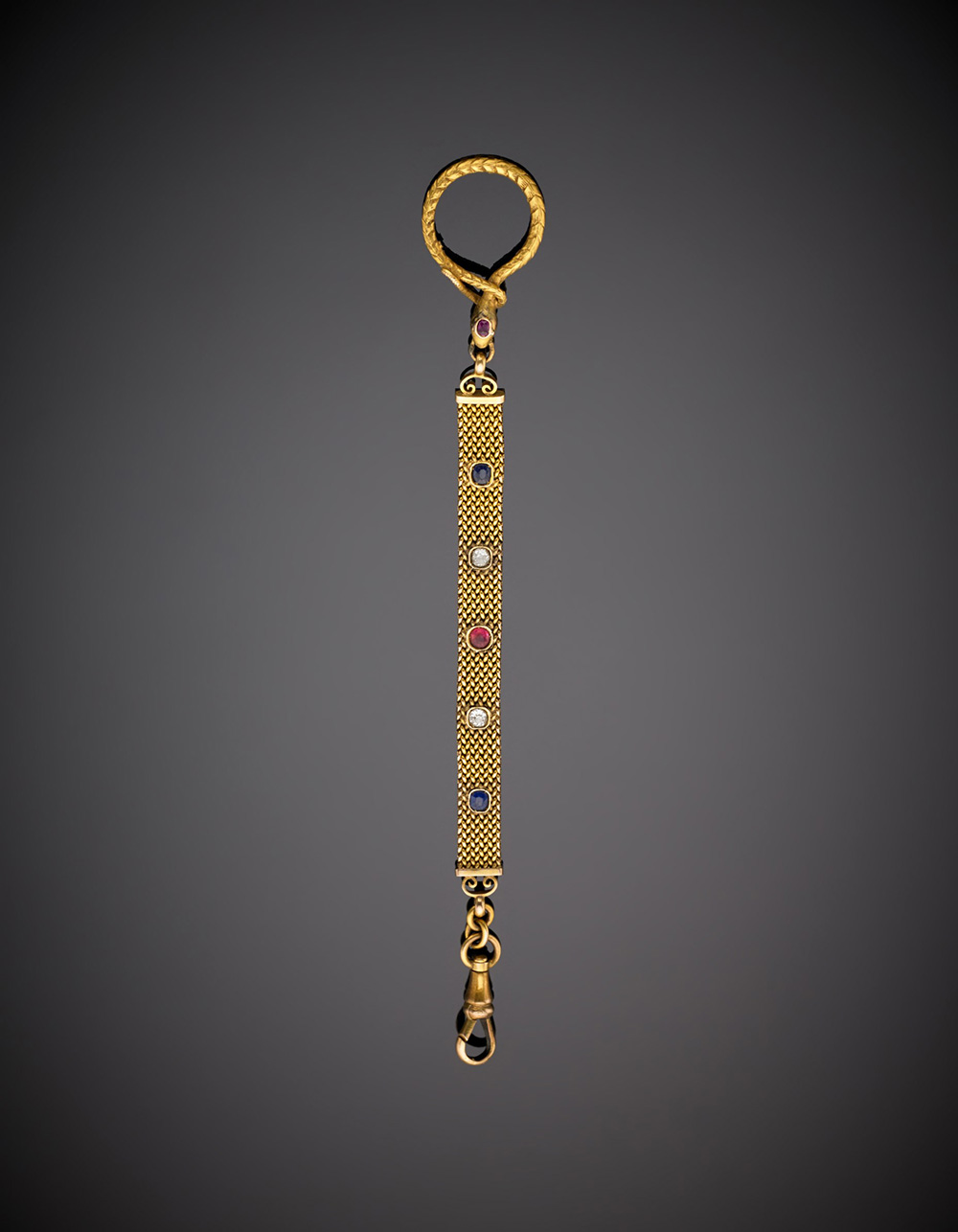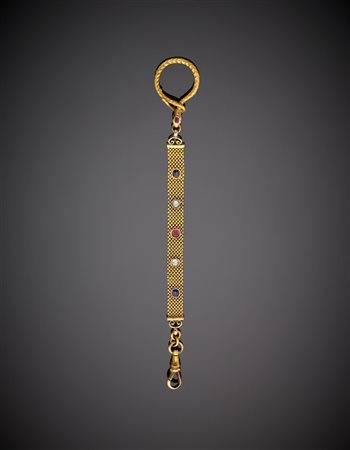 Portachiavi in oro giallo con diamanti, rubino e zaffiri g.10,20 lungh. cm 13,0 circa Yellow gold diamond ruby and sapphire key-ring, g.10,20 length cm 13,0 circa