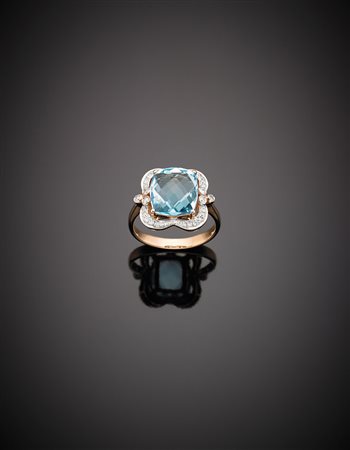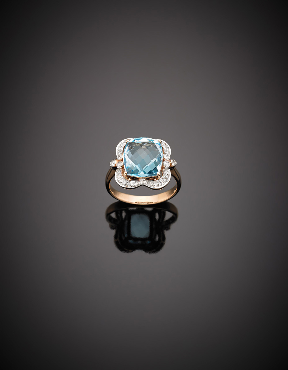 Anello in oro rosa e bianco con diamanti a contornare un topazio azzurro di forma a cuscino di ct. 5,00 circa, g. 5,40 misura Pink and white gold diamond and ct.5,00 circa cushion shape topaz ring, g.5,50 size