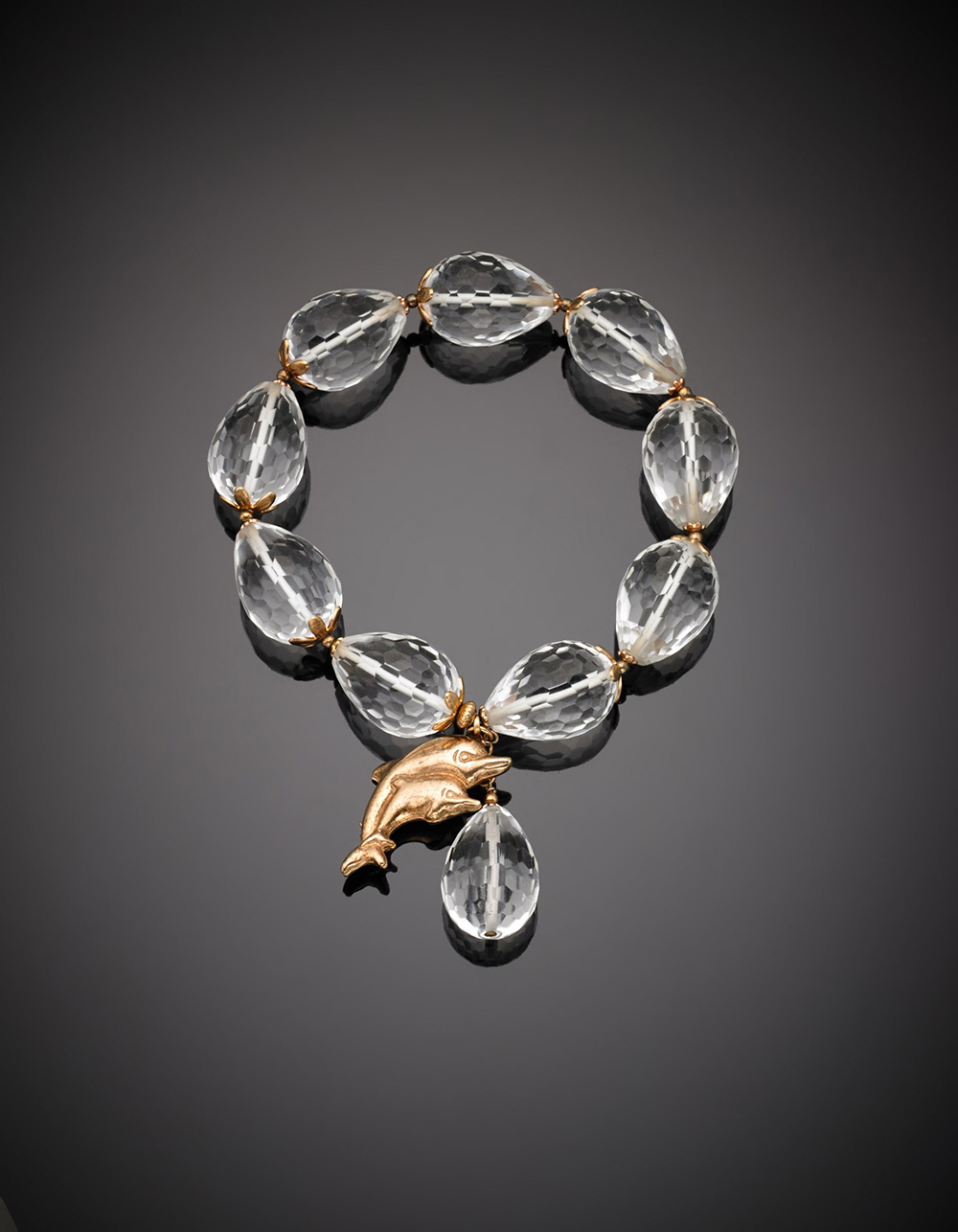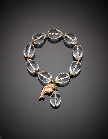 Bracciale in quarzo ialino sfaccettato con distanziatori e pendente di delfini in oro rosso, g.64,60 lungh. cm 20 circa Faceted hyalline quartz bead bracelet with red gold spacers and dolphin pendant, g.64,60 length cm 20 circa