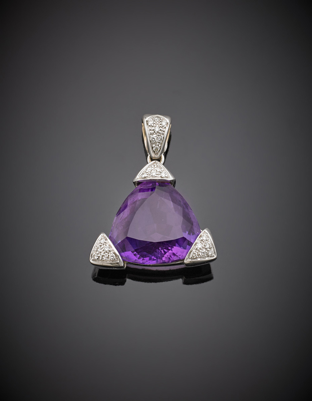 Pendente in oro bianco con ametista triangolare a lati curvi, rifinito con diamanti, g. 10,60 White gold and diamond pendant with triangular amethyst, g.10,60