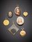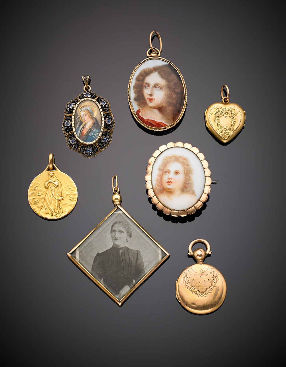 Lotto in oro giallo composto da tre portafotografie, due miniature di cui una pendente e una spilla, una medaglia e un pendente in oro e argento con zaffiri a circondare un'immagine sacra, complessivi g. 37,70 Yellow gold lot comprising three lockets, two miniatures one as pendant the other as brooch, a medal and a gold and silver sapphire pendant, in all g.37,70
