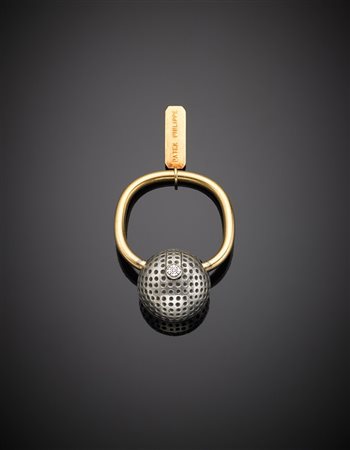 Portachiavi Patek Philippe argento e oro a guisa di pallina da golf, g.17,40 lungh. cm 4,2 Silver and gold Patek Philippe golf ball key-ring, g.17,40 length cm 4,2
