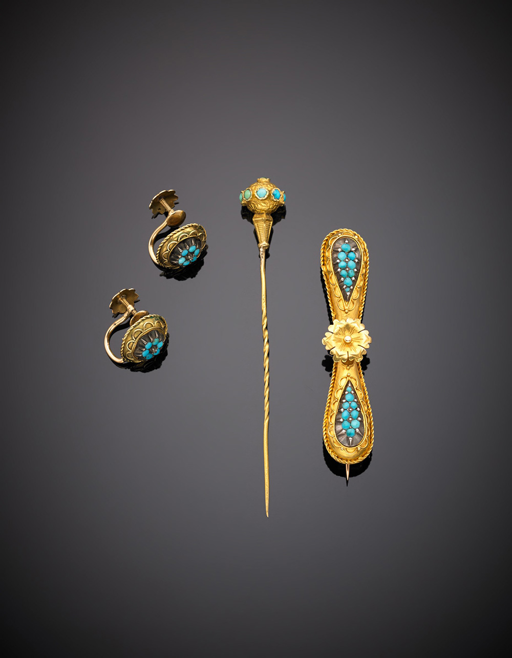 Demi-parure in oro giallo composta da spilla, spillone ed orecchini a lobo rifinita con turchesi, complessivi g. 10,30 Yellow gold and turquoise set comprising a brooch, a tie-pin and earrings, in all g. 10,30