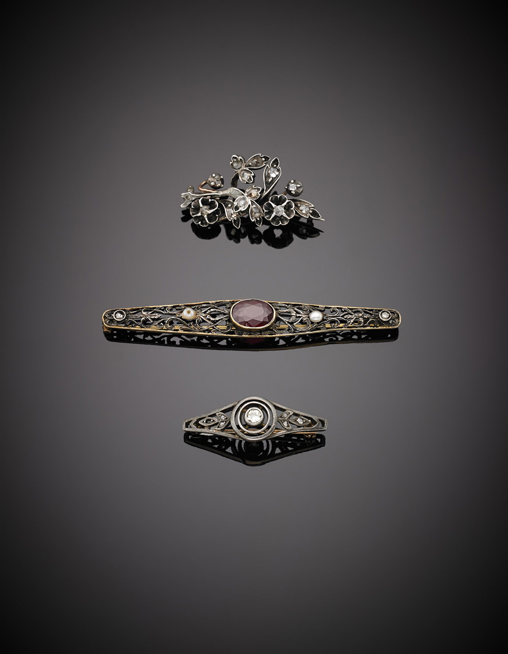 Lotto di tre spille in oro giallo, rosso e argento con diamanti, perle e un granato ovale, g.13,30 Red, yellow gold and silver lot composed of three brooches with diamonds, pearls and an oval garnet, g.13,30