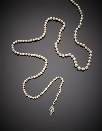 Collana lungha di perle, bianche con sfumatura crema e grigia, il 40% circa naturali di acqua salata, a scalare da mm 3,05 a mm 5,82, g. 23,20 lungh. cm 99,5 Long white cream-grey hued graduated pearl necklace of which 40% natural salt water pearls, from mm 3,05 to mm 5,82, g. 23,20 length cm 99,5