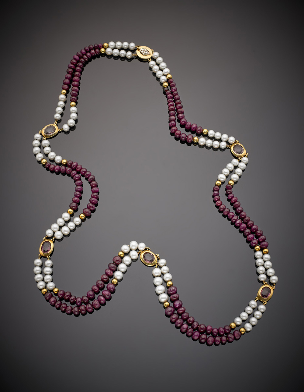 Collana a due fili di perle grigia e granati distanziati da boules in oro giallo e ametiste ovali, la chiusura rifinita con diamanti, g. 117,10 lungh. cm 79 circa Two strand grey hued pearl and garnet necklace with gold bead and amethyst spacers, the clasp accented with diamonds, g.117,10 length cm 79 circa