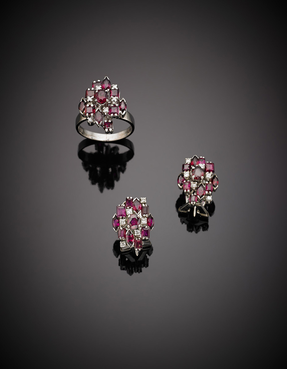Demi-parure in oro bianco composta da anello e orecchini con rubini e...