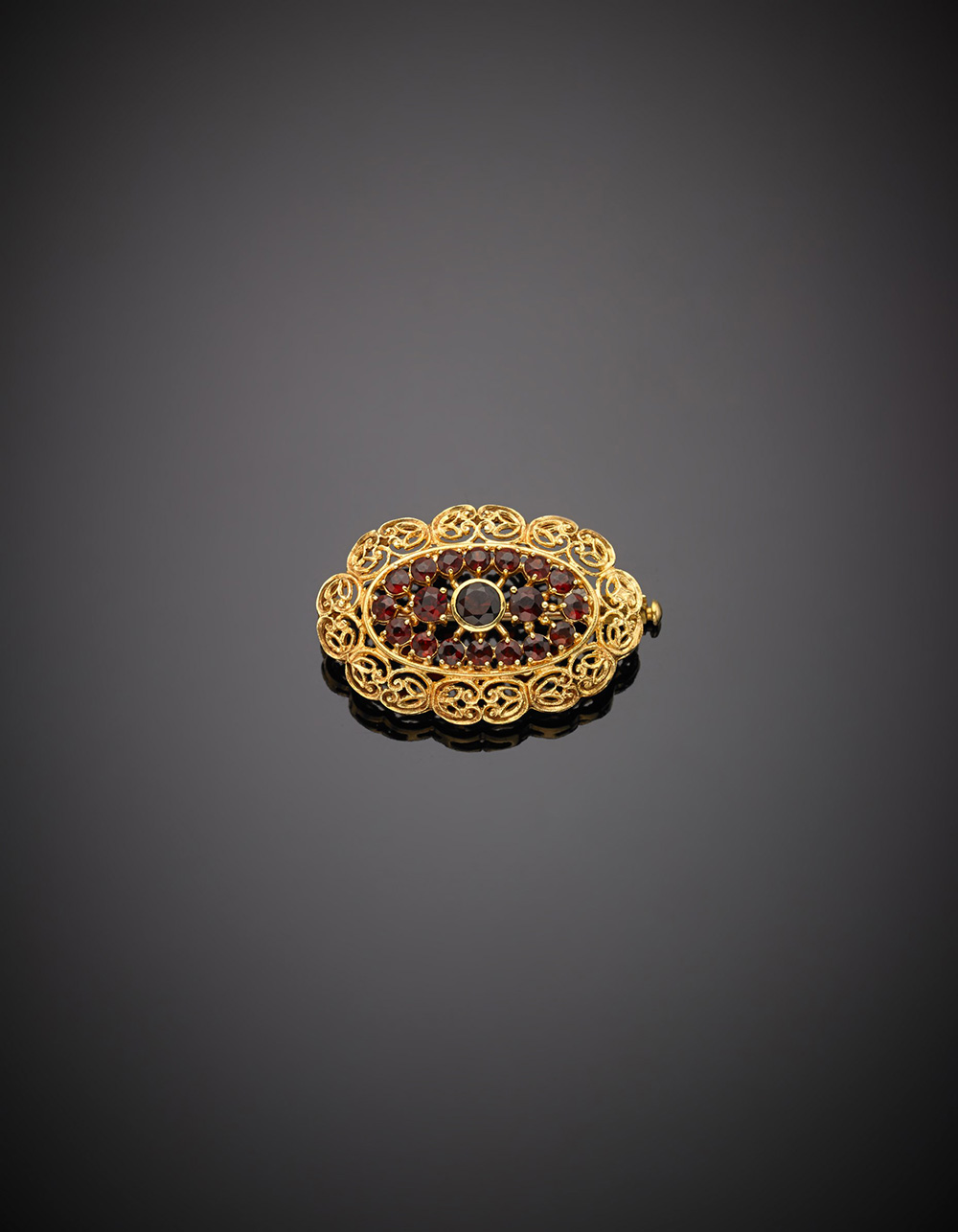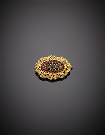 Spilla in oro giallo ovale "filigranato", granati al centro, g. 7,50 Yellow...