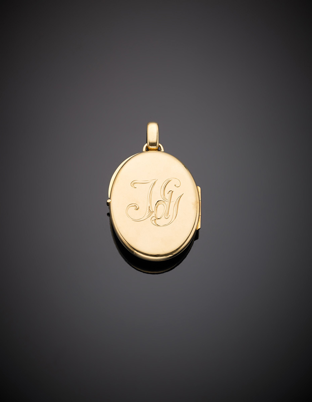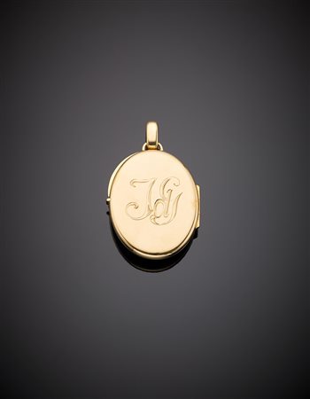 Portafoto ovale in oro giallo con zaffiro cabochon e due diamanti rotondi, iniziali incise, g.25,40 cm5,4x3,3 Yellow gold oval locket with a cabochon sapphire and two small diamonds, g.25,40 cm5,4x3,3