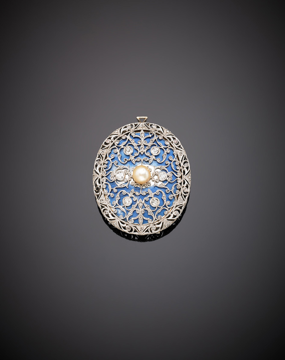 Spilla/pendente con portafoto sul retro in platino, diamanti e perla...