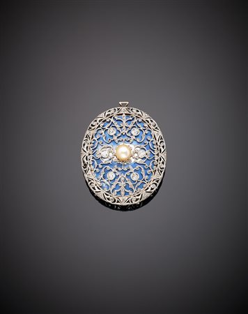 Spilla/pendente con portafoto sul retro in platino, diamanti e perla centrale; lo spillone in oro bianco, g. 27, largh. cm 4,5 circa (difetti)