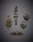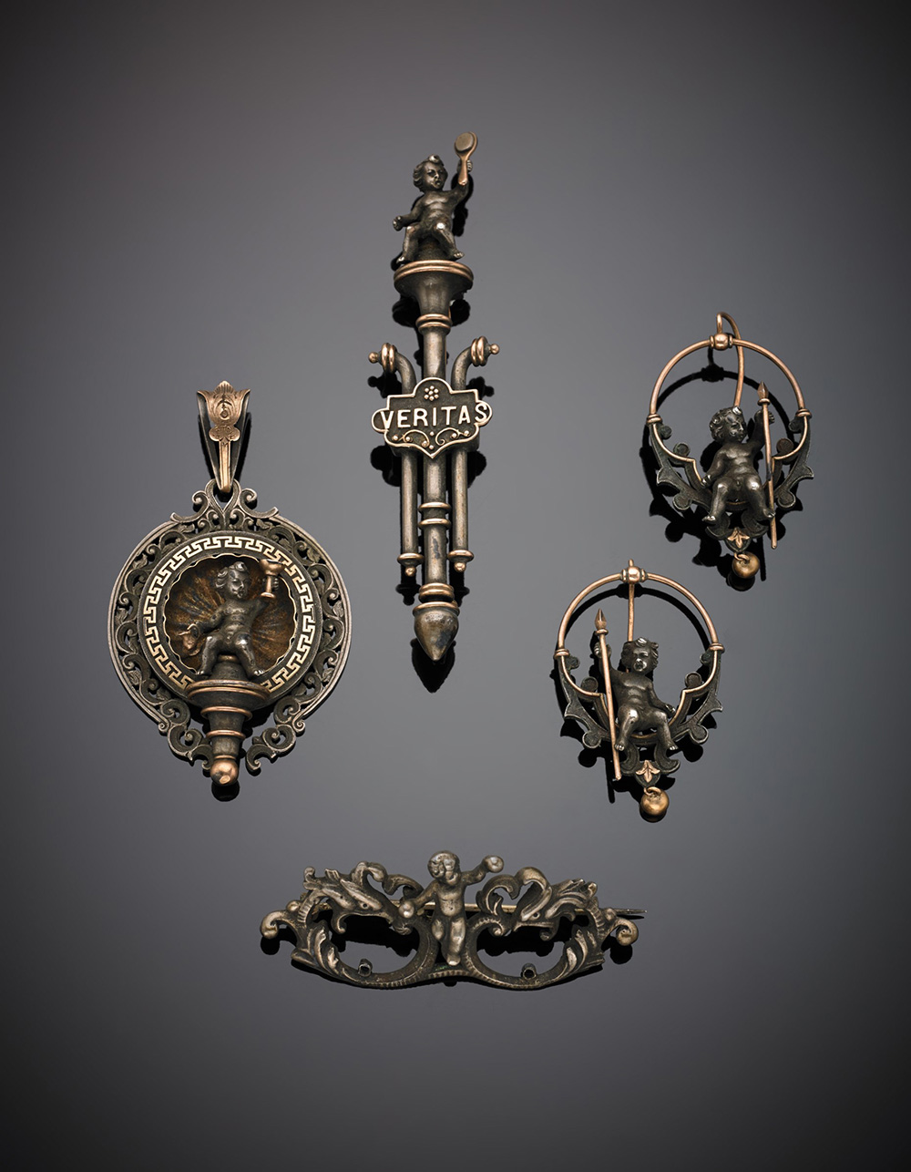 Due spille, un paio di orecchini e un ciondolo in metallo con finiture in oro 333/1000, complessivi g.69,10 Metal and 9K gold set composed of earrings, two pins and a pendant with cherubs, in all g.69,10