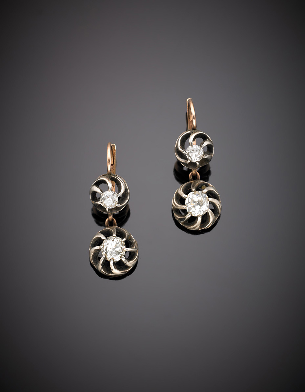 Orecchini pendenti in oro e argento con diamanti, g. 4,80, lungh. cm 2,70 circa Yellow gold and silver diamond pendant earrings, g.4,80 length cm 2,70 circa