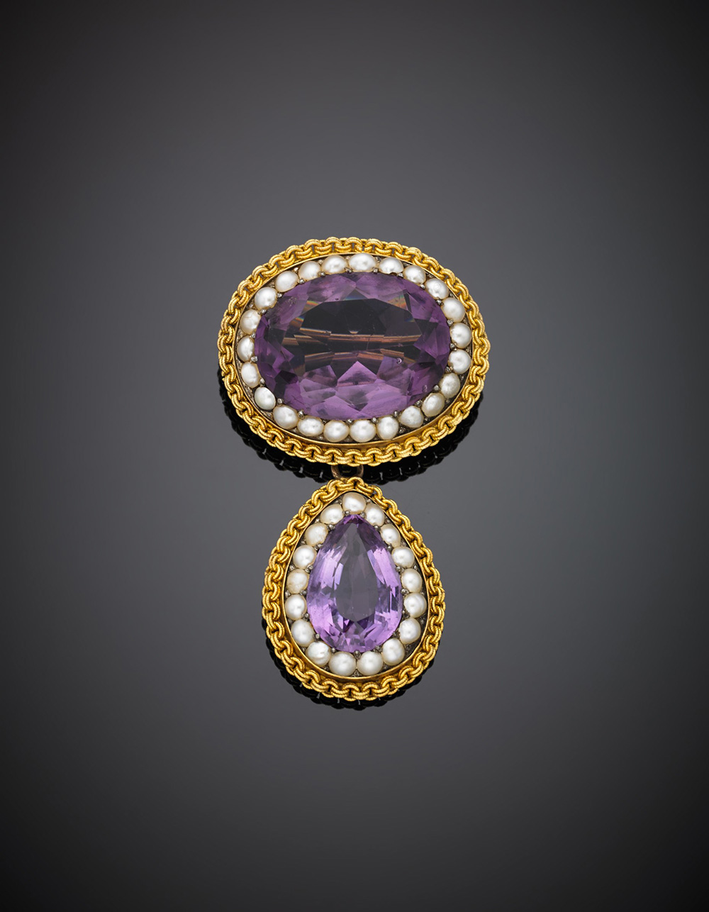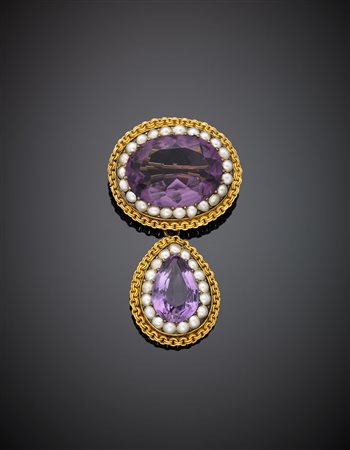 Spilla con pendente in oro giallo con perline una ametista e una pasta vitrea, g.19,40 lungh. cm 5,70 circa Yellow gold amethyst, vitreous paste pearl brooch with pendant, g.19,40 length cm 5,70 circa
